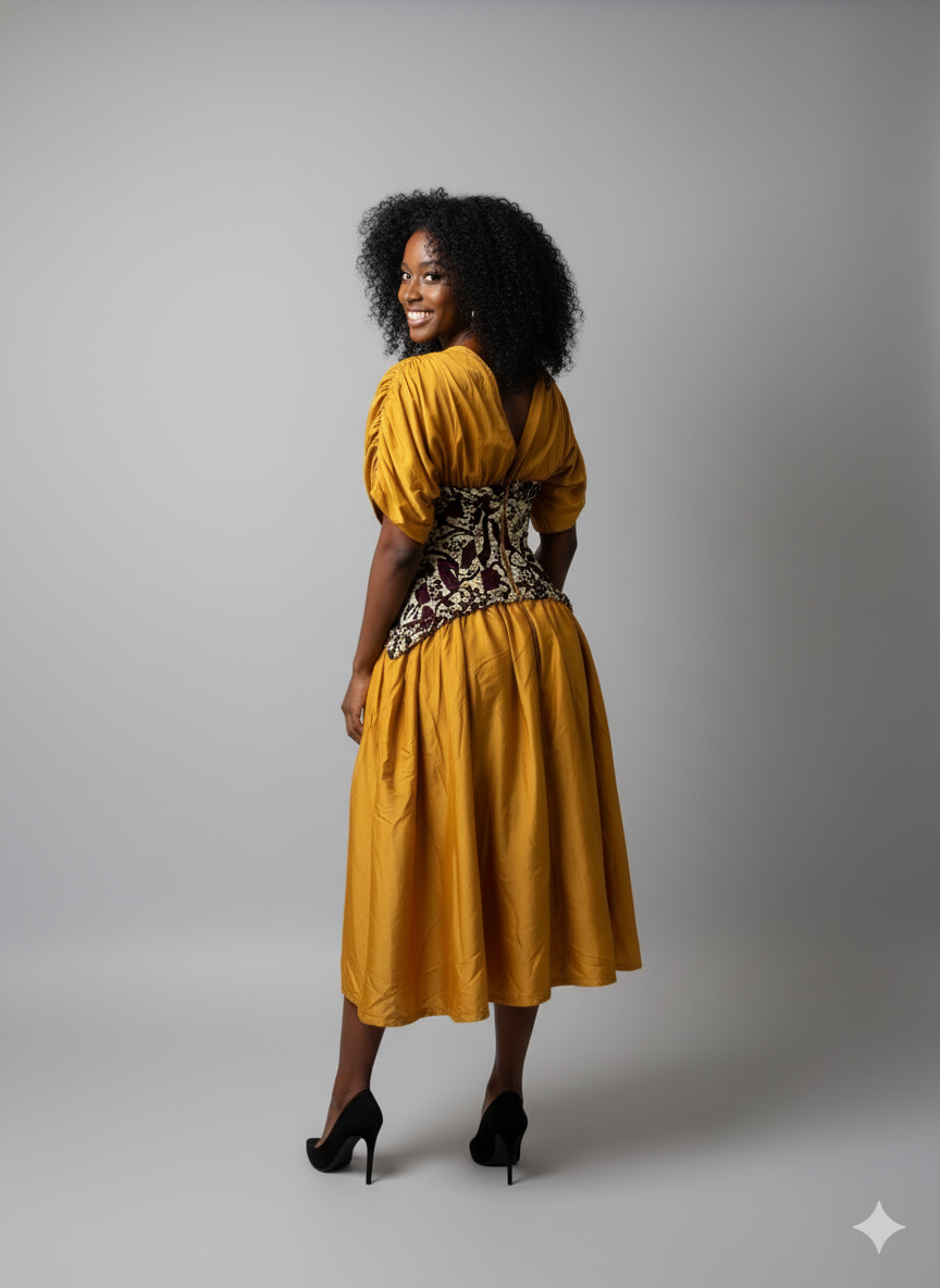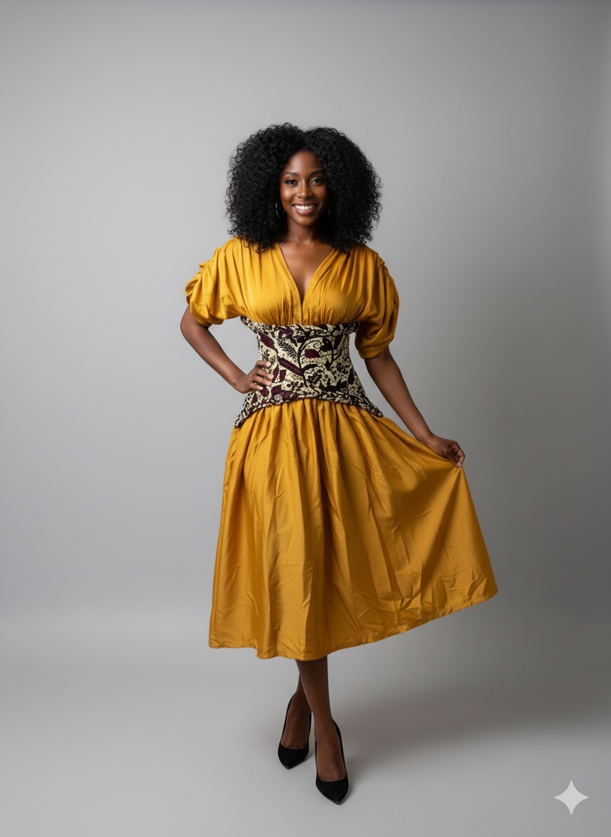 This elegant midi dress features a rich mustard fabric that drapes beautifully. It has a flattering V-neckline and short, puffed sleeves. The standout detail is the vibrant African print chartreuse corset-style waist panel, adorned with an intricate, botanical pattern. This cinched waist creates a stunning silhouette, flowing into a graceful, gathered A-line skirt. The dress is perfect for a special occasion, offering a blend of sophistication and unique style.